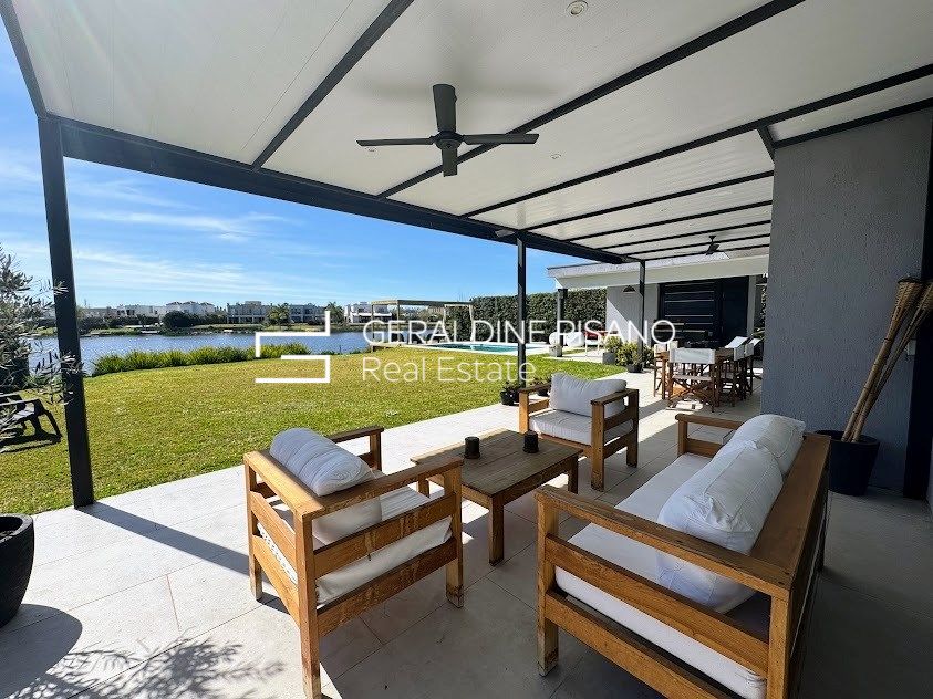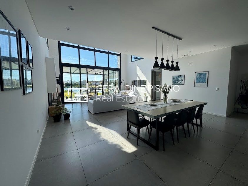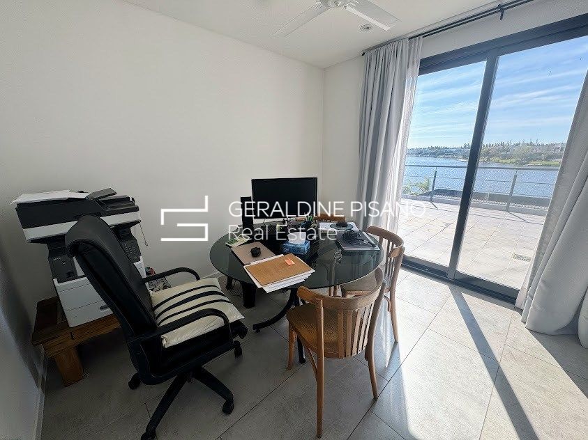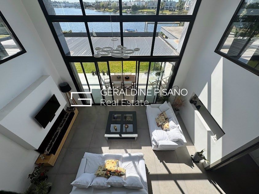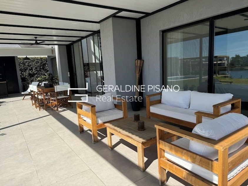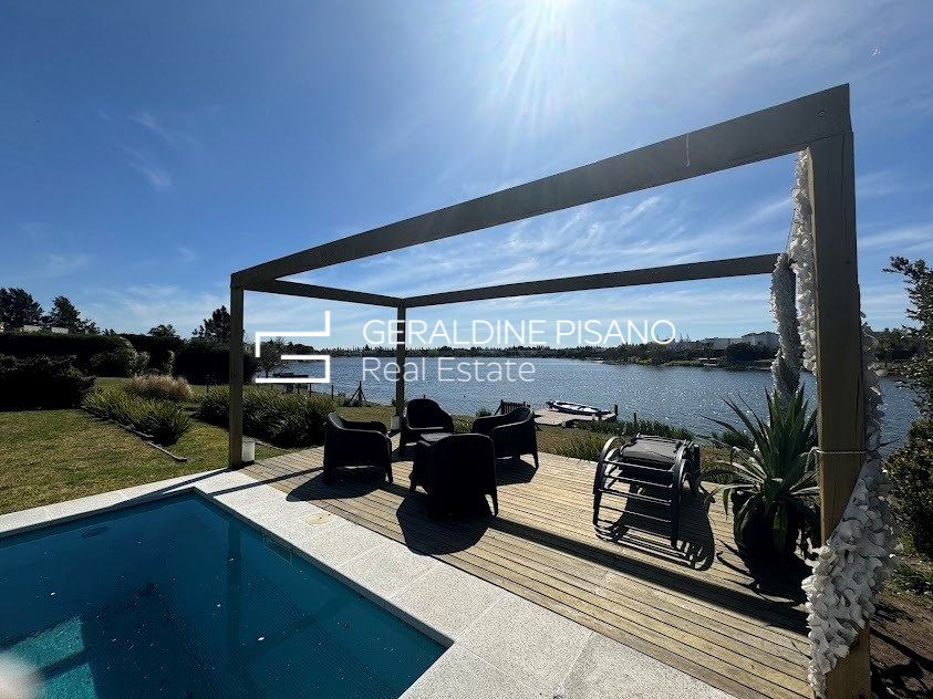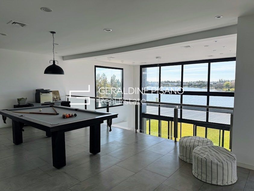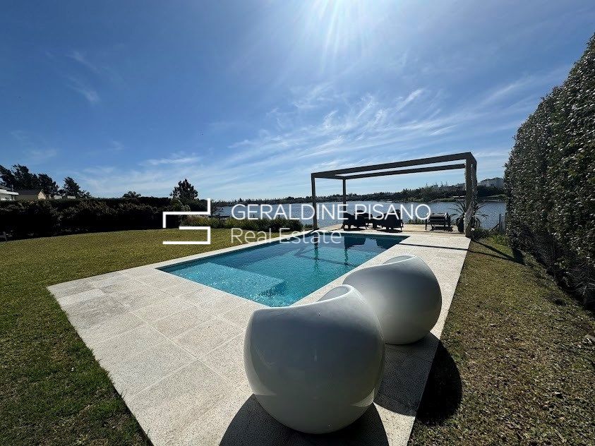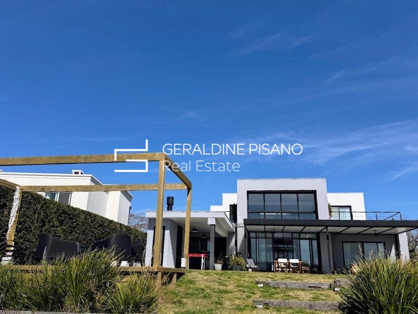Imponente casa en venta en dos plantas en el Barrio Santa Teresa con vista abierta a la laguna. Planta baja: *Jardin de luz *Living comedor con hogar *espacios del living con doble altura y grandes ventanales *Toilette *Espacio de guardado *Gran cocina comedor con dos mesadas en silestone, espacios de guardado e isla grande *Lavadero con entrada independiente *2 Dormitorios en suite - el principal de grandes dimensiones con vestidor cerrado, y con vista abierta a la laguna -el 2do dormitorio en suite con gran placard Planta Alta: *Hall de distribución con playroom y sala de juegos con balcon hacia el living *2 dormiorios con placard *1 baño completo *2 terrazas Exterior: * galeria en L con living, barra, parrilla *Piscina *baño de Piscina *Camastros *Fogonero *salida a la laguna *Muelle con iluminación *Riego por aspersion *grama bahiana Cochera semicubierta para dos vehiculos y descubierta para cuatro vehiculos mas La propiedad posee Abertuas DVH, calefaccion central, ventiladores de techo en los dormitorios + aire acondicionado en todos los ambientes. La construcción es en Steel Framing